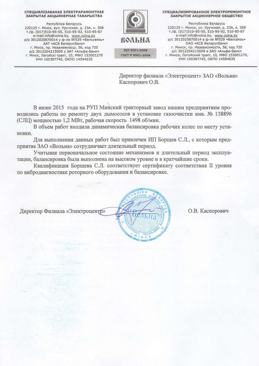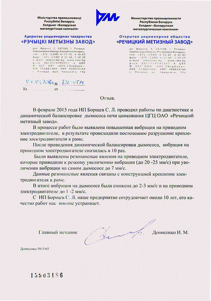 С самого начала изучения направления вибродиагностики и современных методов неразрушающего контроля мы ставим нашей целью выполнение нашей работы на высочайшем уровне. Наличие множества постоянных клиентов, отличные рекомендации и добрые отношения с высшим техническим персоналом предприятий Беларуси подтверждают качество нашей работы.